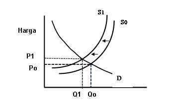 Pergeseran ini menyebabkan titik keseimbangan baru dengan harga keseimbangan baru mengalami kenaikan (P1) dan jumlah keseimbangan baru mengalami penurunan (Q1).
