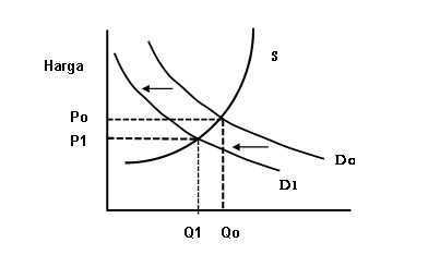 Oleh karena itu, pergeseran ini menyebabkan titik keseimbangn baru dengan harga keseimbangan baru (P1) dan jumlah keseimbangan dari permintaan baru (Q1) mengalami penurunan.