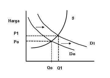 Oleh karena itu, pergeseran ini menyebabkan titik keseimbangan baru dengan harga (P1) dan jumlah keseimbangan baru dari permintaan (Q1) mengalami pertambahan.